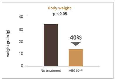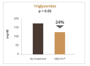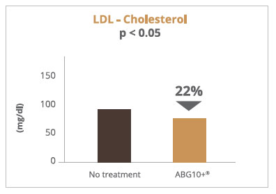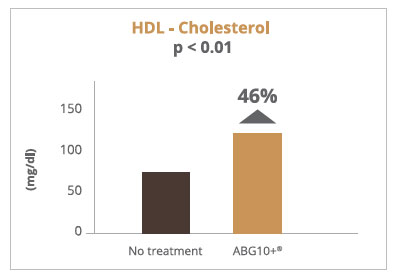 - במחקר נוסף [3] שנעשה בנוגע למיצוי ABG10+, שפורסם בשנת 2018, נמצא בניסוי כי אצל חולדות שטופלו בתמצית במשך 16 שבועות נמדדו ערכים נמוכים יתר של ספיגת קלוריות משקל גוף, נרשמה ירידה ברמות הטריגליצרידים והכולסטרול הרע (LDL), וכן חלה עלייה ברמת הכולסטרול טוב (HDL) זאת לעומת חולדות שלא טופלו בתמצית ולא נמצאו בהן השפעות אלו.